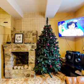 К тому же, в коттедже есть караоке, спутниковое телевидение, диски, музыкальный центр, большой угловой кожаный диван, в углу камин из камня, большая плазма.